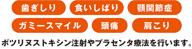 また、プラセンタ注射、内服薬投与により、自律神経のバランスを整え、ストレスを起因とする悪習癖(食い縛り、歯ぎしり等)を緩和させます。